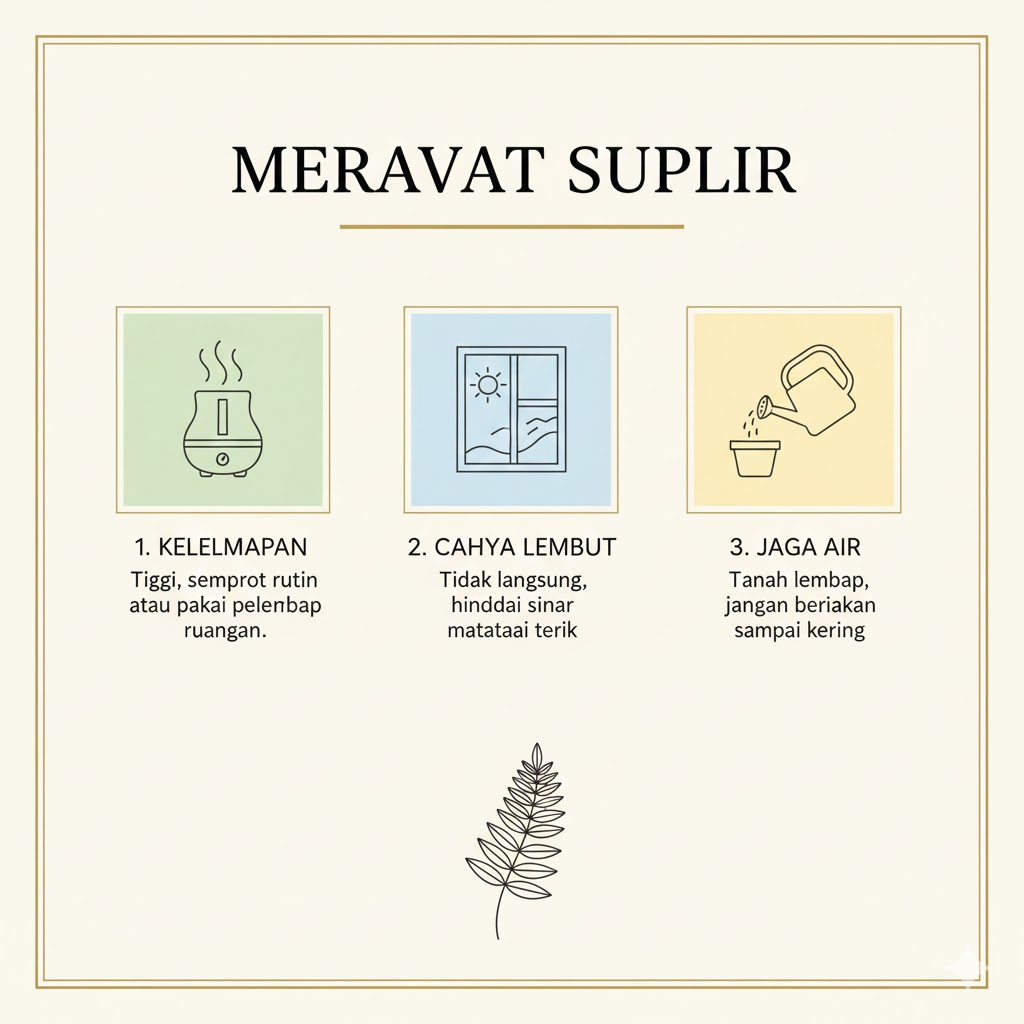 Meskipun tampil lembut, suplir membutuhkan perhatian khusus. Tanaman ini menyukai kelembapan tinggi dan suhu yang stabil. Dalam rangkaian bunga potong, suplir perlu diberi air yang cukup dan ditempatkan di ruangan yang tidak terlalu panas. Daun suplir tidak boleh terkena sinar matahari langsung karena dapat mengering. Perawatan yang tepat akan membuat suplir tetap segar dan cantik lebih lama.
